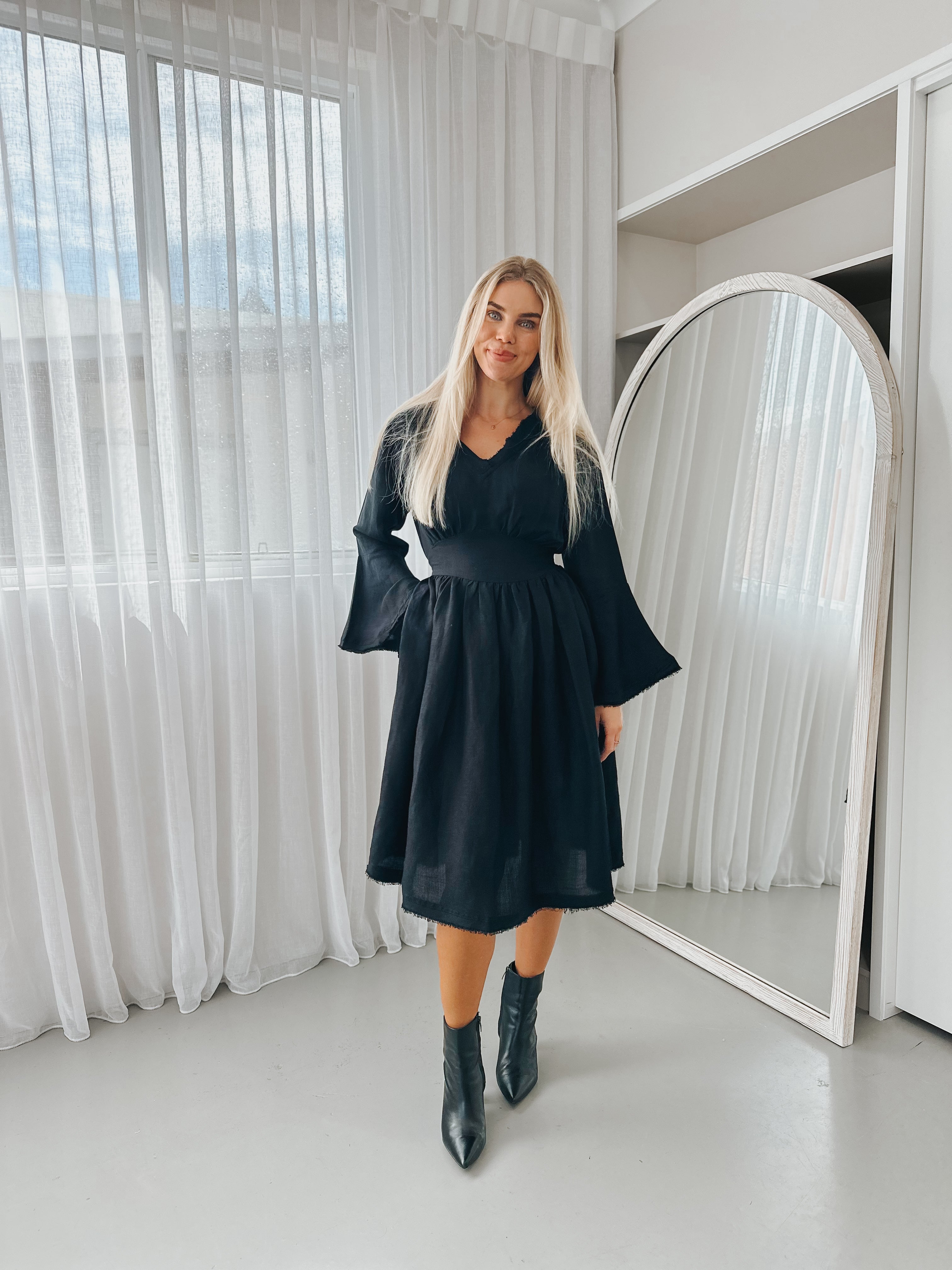 Raw edge trim feature on neckline, sleeve hem, and skirt hem