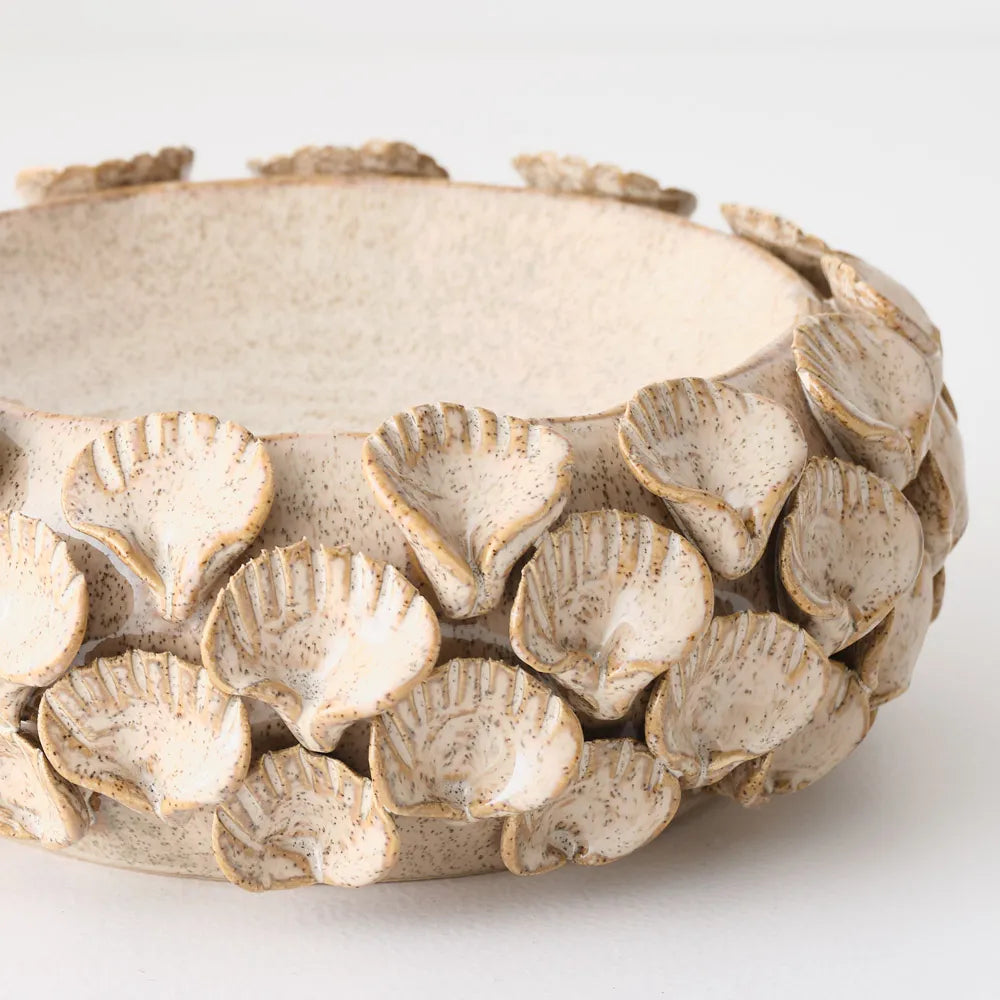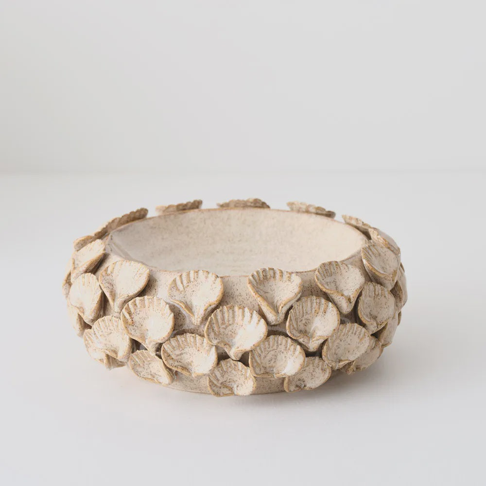 A charming ceramic bowl adorned with delicate shell details. Part of a collection designed to bring a touch of coastal charm, perfect for Hamptons-inspired and beachside spaces.