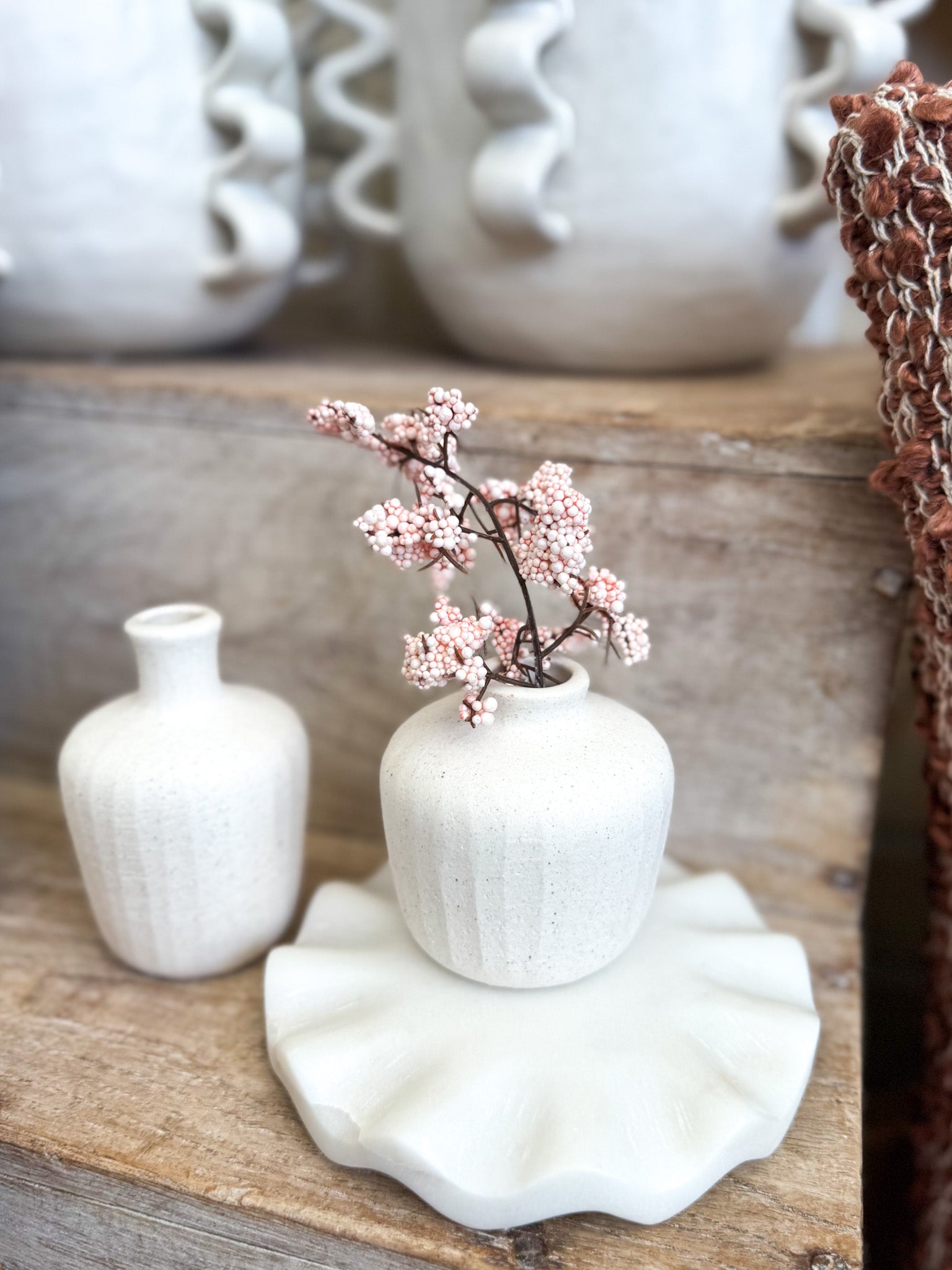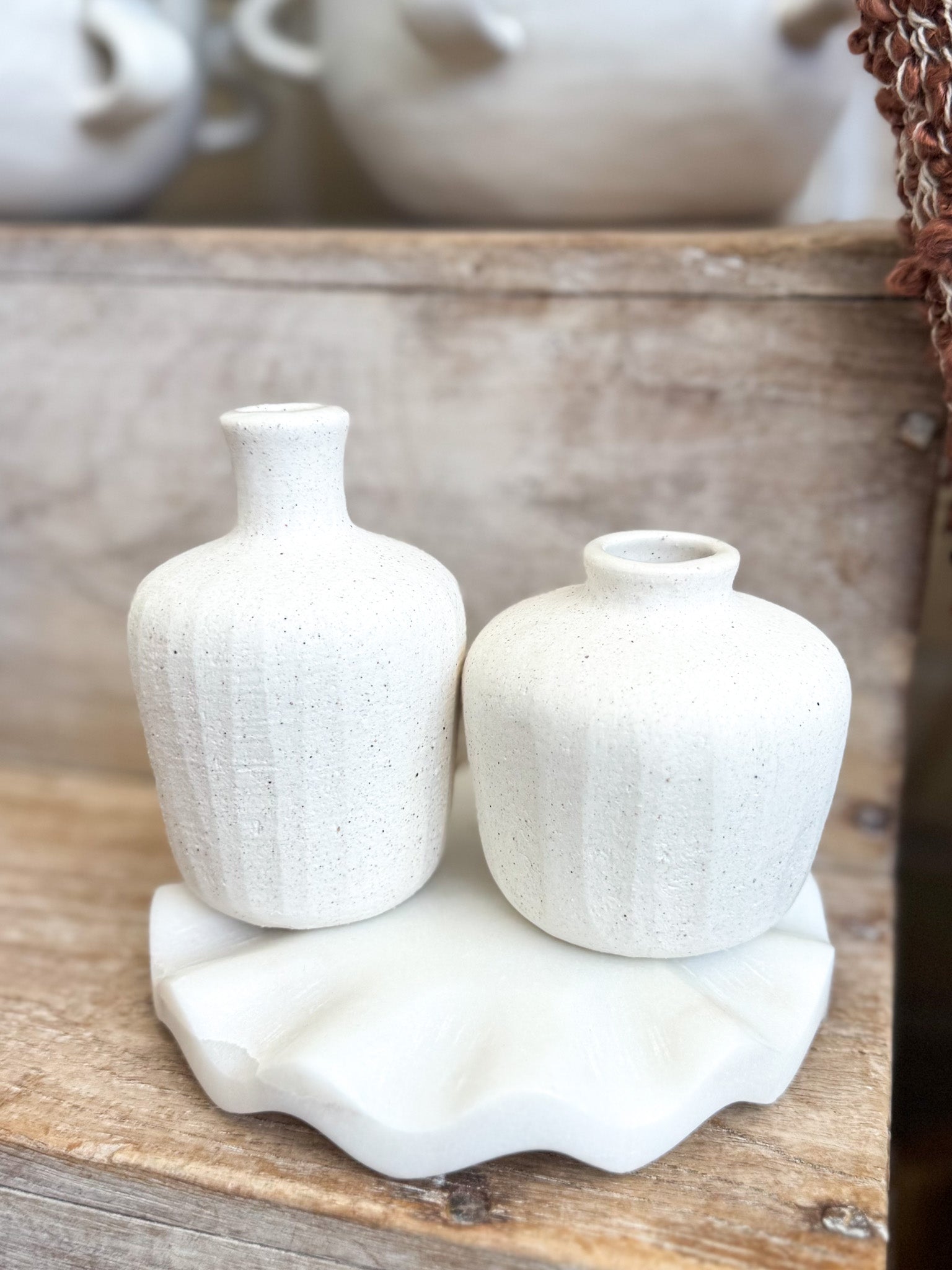 A refined collection of speckled white ceramic vessels, each featuring hand-finished linear details. Bringing subtle texture and artisanal charm to any interior. Not guaranteed to hold water.