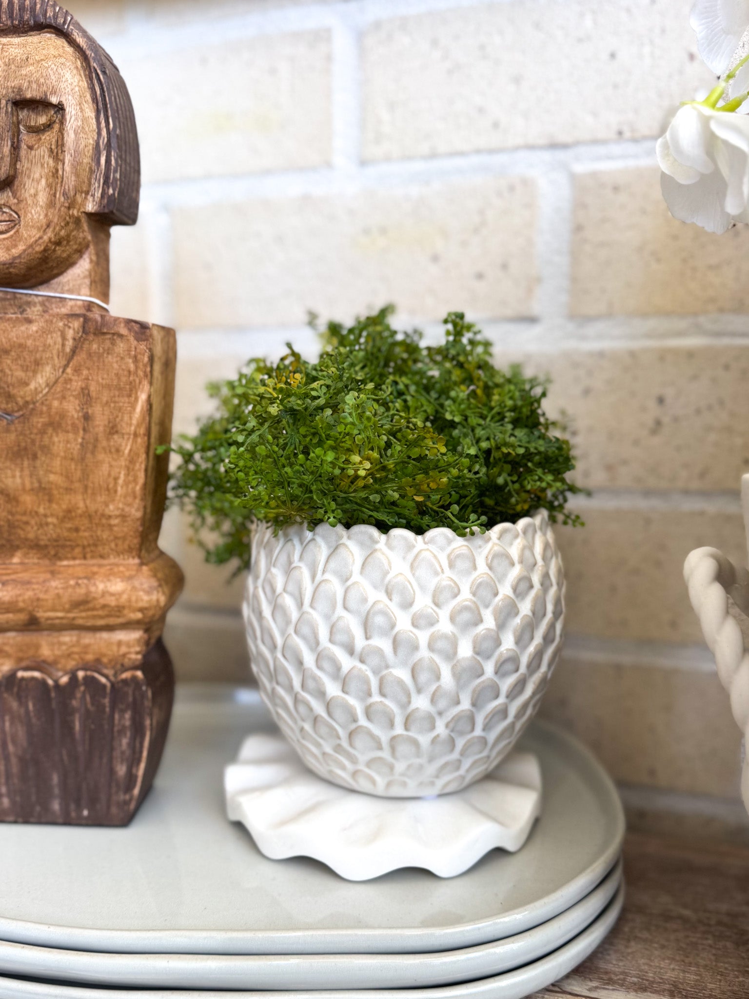 A ceramic pot featuring a scale-like detailed finish and a beautiful hand-glazed surface. Perfect for housing small plants and adding subtle texture to your space.